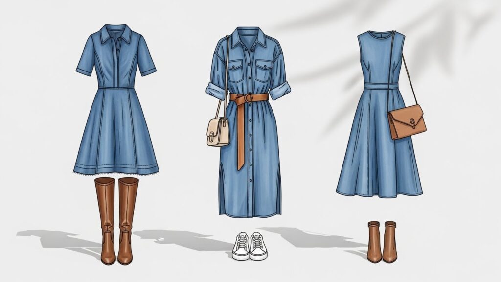 • Boots: Ankle boots for fall outfits, knee-high boots with denim dresses, and combat boots for street style.
