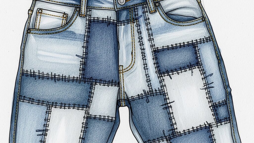 Patchwork denim is rising fast in denim fashion 2026 thanks to its artsy, handcrafted vibe. This includes panel stitching, multi-shade denim patches, raw hems, and textured seams.