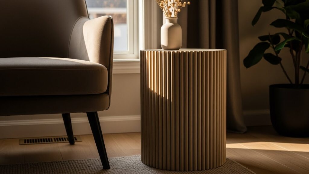The Process: simply measure your dowels to fit the height of your base, glue them vertically around the cylinder, and finish with a coat of ‘Sage Green’ or ‘Creamy Beige’ matte paint. This adds instant texture and architectural interest to your room, making it a perfect example of modern DIY furniture that looks professionally made.