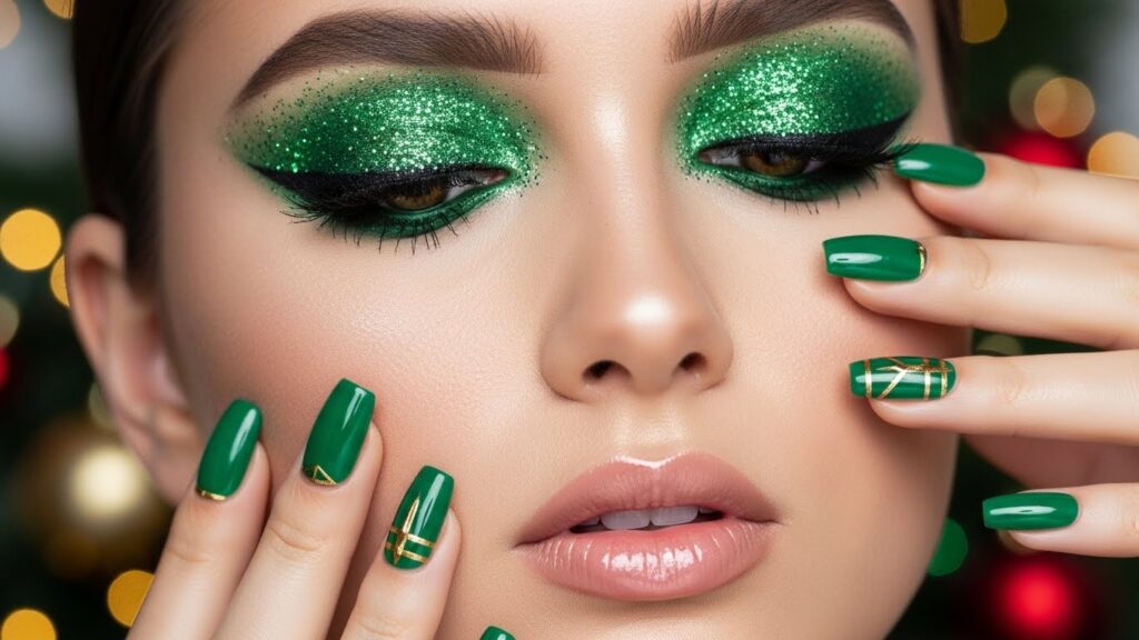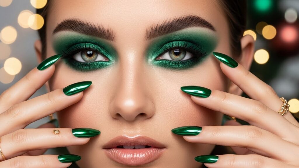 Green is one of the most iconic holiday colors, and in 2025, beauty lovers are elevating it with rich tones, chrome finishes, and gemstone accents. This Christmas makeup pairs beautifully with emerald green nails, creating a bold, festive, and luxurious seasonal look. This combo works best for evening parties, Christmas dinners, and glamorous winter photoshoots.
