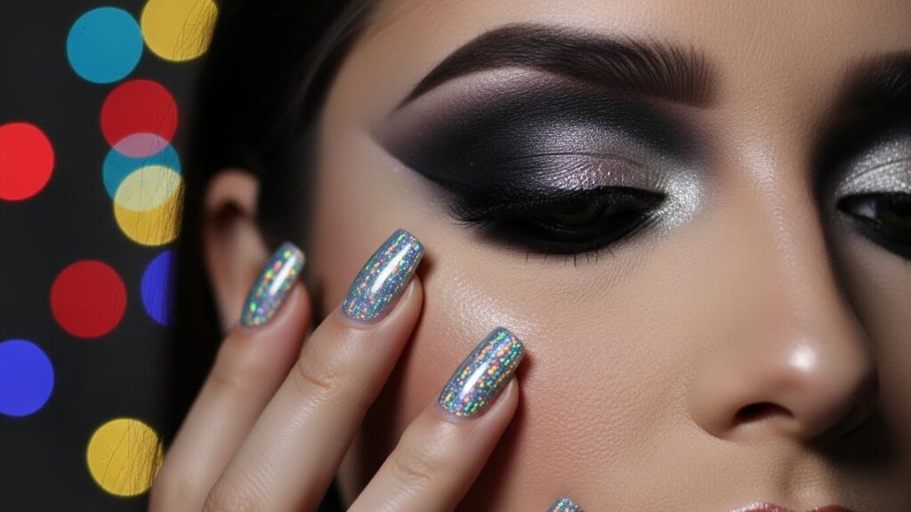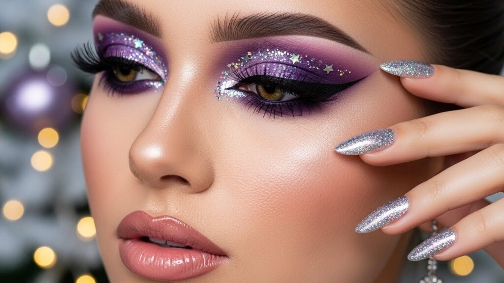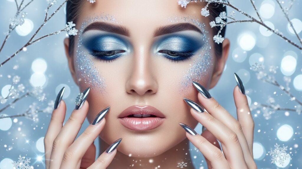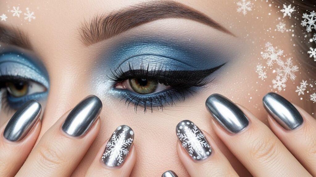 - Chrome Silver – Futuristic Christmas makeup + mirror-shine nails