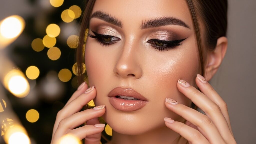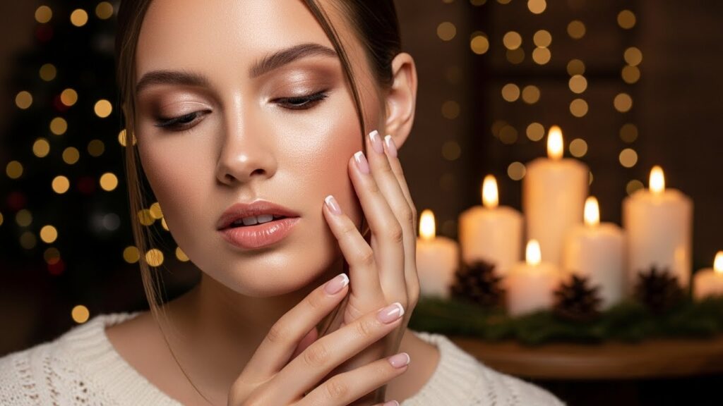Not every holiday look needs glitter or bold color. Soft Christmas makeup focuses on fresh skin, nude tones, and subtle sparkle. Paired with minimalist nails, this style delivers a timeless and elegant holiday look ideal for family gatherings, brunches, and low-key celebrations.