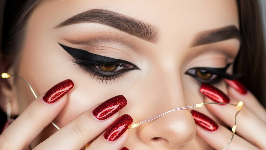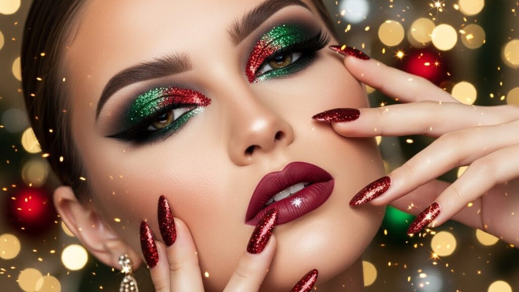 Christmas beauty trends 2025 are all about glamour, glow, and color coordination. The most popular looks combine bold festive makeup with nails that match in tone, finish, or texture. Think glitter eyes + glitter nails, red lips + red nails, or gold shimmer makeup with gold chrome manicures. This year, holiday beauty is designed to complement outfits, enhance your overall style, and add a cohesive holiday aesthetic.