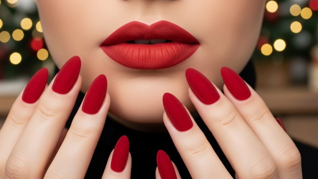 For a luxurious Christmas look, go for matte red lipstick paired with velvet red nails.