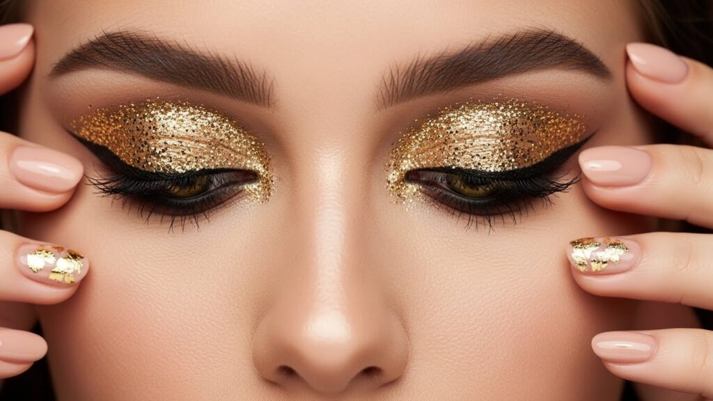Bold Gold Glitter Eyes + Nude Nails with Gold Flakes