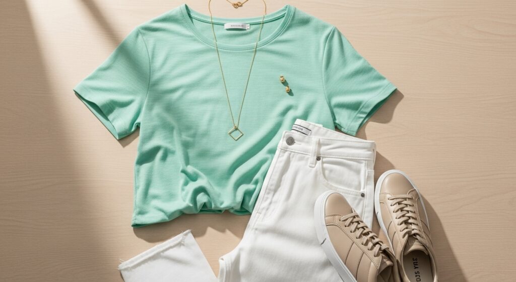 - A mint green top with white jeans