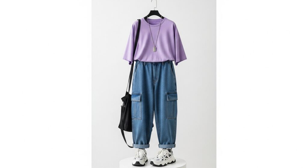 - A lavender oversized tee with denim cargo pants