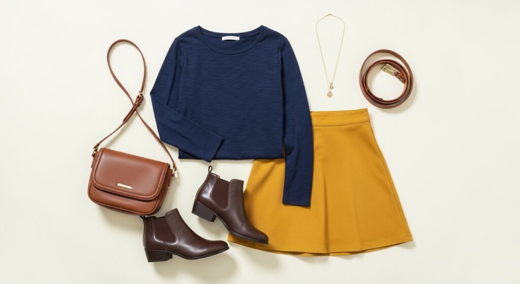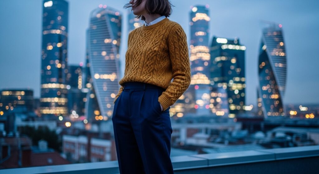 When choosing work outfits, focus on elegant and balanced shades like navy and mustard, burgundy and beige, or olive green and brown. These colors look professional and modern, especially for office settings or hybrid workdays.
