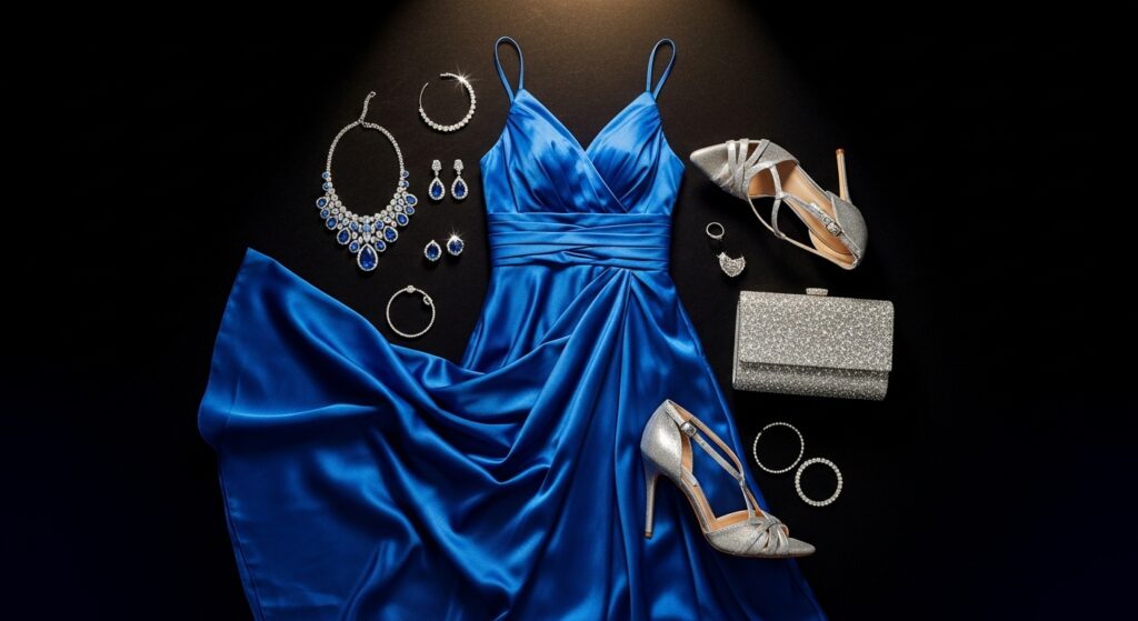 - A royal blue jumpsuit with silver heels