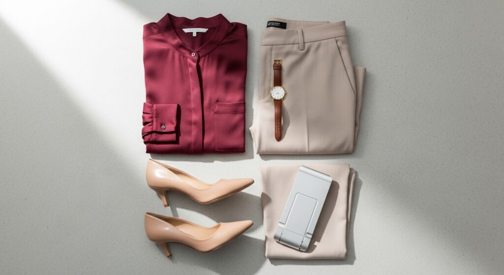 - A burgundy blouse with beige trousers