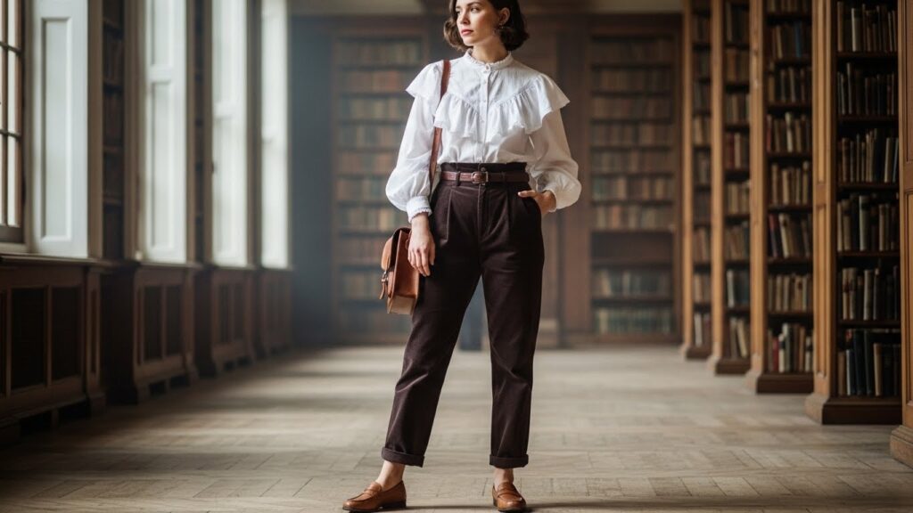 To master this look without feeling like a costume, start with a white ruffled blouse tucked into high-waisted corduroy trousers. Swap your sneakers for leather loafers or Mary Janes. It’s a sophisticated, intellectual vibe that works perfectly for university students or creative professionals.