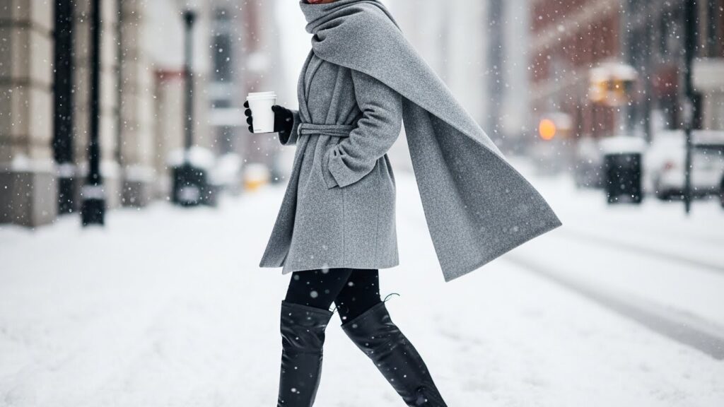 If you are tired of standard puffer jackets, 2026 is the year of the Cape Coat and Scarf-Coat. This trend adds instant drama and elegance to any cold-weather outfit. The “Scarf-Coat” (a coat with an attached matching scarf) is particularly huge right now because it is effortless styling built into one piece.