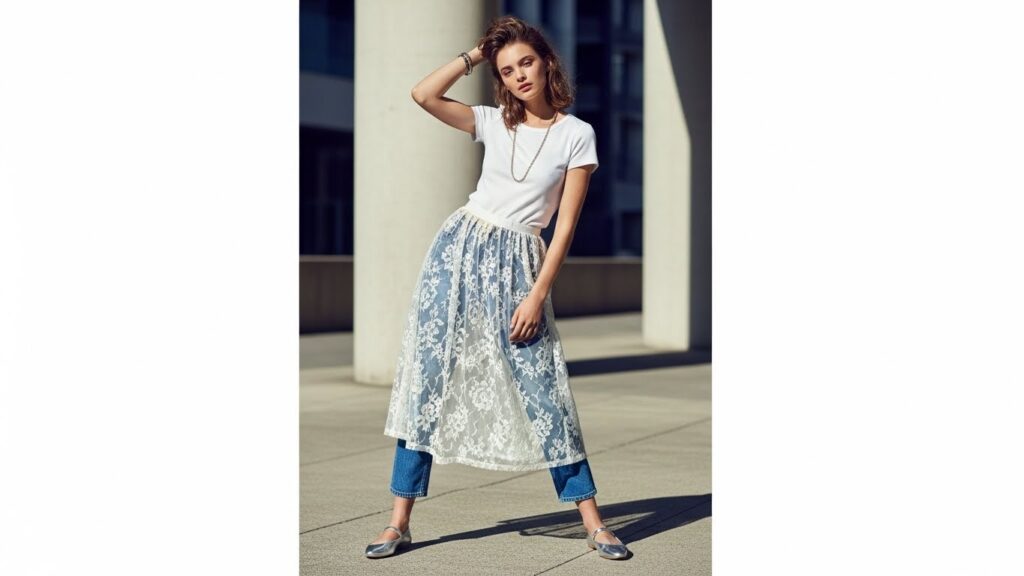For a beginner-friendly version, try a sheer lace skirt layered over straight-leg blue jeans. Alternatively, a pleated mini skirt over matching suit trousers creates a sharp “Office Siren” look. It’s a bold choice that signals you are ahead of the fashion curve.