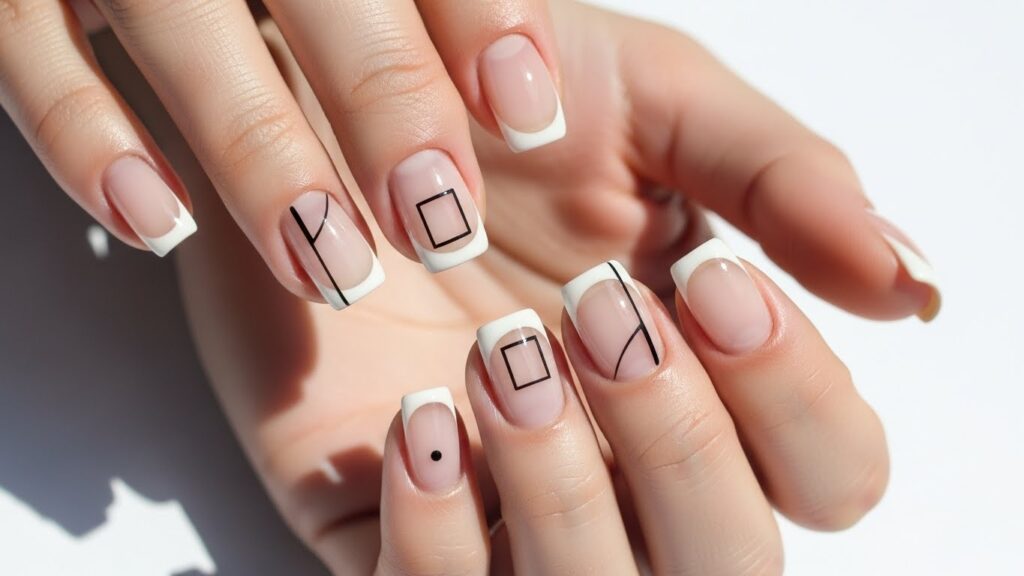 Negative space designs use the natural nail as part of the artwork, creating a minimal, modern look. Thin diagonal lines, geometric shapes, and half-moon designs are trending.