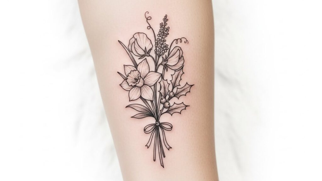 - The Trend: In 2026, the solo rose tattoo is stepping aside for something deeply communal: the combined birth flower bouquet. Rather than a generic floral design, this trend focuses on “botanical storytelling.” It involves selecting the specific birth month flower for each family member (e.g., a Snowdrop for January, a Daisy for April, a Poppy for August) and asking an artist to bind them into a single, cohesive arrangement.