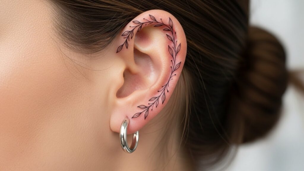 - The Ear (Helix): The helix tattoo is the new cartilage piercing. These designs sit on the curved rim of the upper ear. Popular choices include tiny olive branches wrapping around the curve or small stars that look like stud earrings. It’s a clever way to “accessorize” without wearing actual jewelry.
